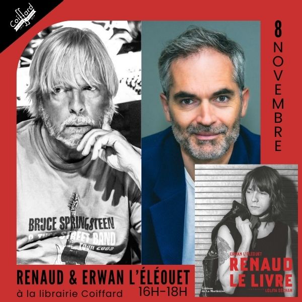 Dédicace exceptionnelle avec Renaud et Erwan L'Éléouet autour de "Renaud Le Livre", sous la direction de Lolita Séchan, publié aux Éditions de la Martinière. ATTENTION, l'achat du livre à la librairie Coiffard est une condition à la dédicace. Signature sans réservation ou inscription dans la limite du temps imparti (16h>18h) À propos du livre : Un livre rassemblant des archives et des témoignages inédits pour célébrer les 50 ans de carrière d'un des chanteurs les plus populaires Loubard au cœur tendre, chanteur révolté, acteur occasionnel, observateur critique de l’actualité, humaniste, anarchiste, mari et père, Renaud est tout cela à la fois – et bien plus encore. Chacune de ses luttes, de ses chansons, de ses joies ou de ses peines, se fond dans un même récit. Ce beau livre révèle la face intime d’un artiste sensible, d’un poète engagé qui, depuis cinquante ans, sait capter les humeurs de notre époque et raconter les soubresauts de la société française et de son histoire. Un artiste en guerre contre lui-même aussi. Récit de l’intérieur, que Renaud et ses proches nous offrent en partageant des archives totalement inédites. photo Renaud © David Séchan photo Erwan L'Éléouet © Frédéric Murarotto