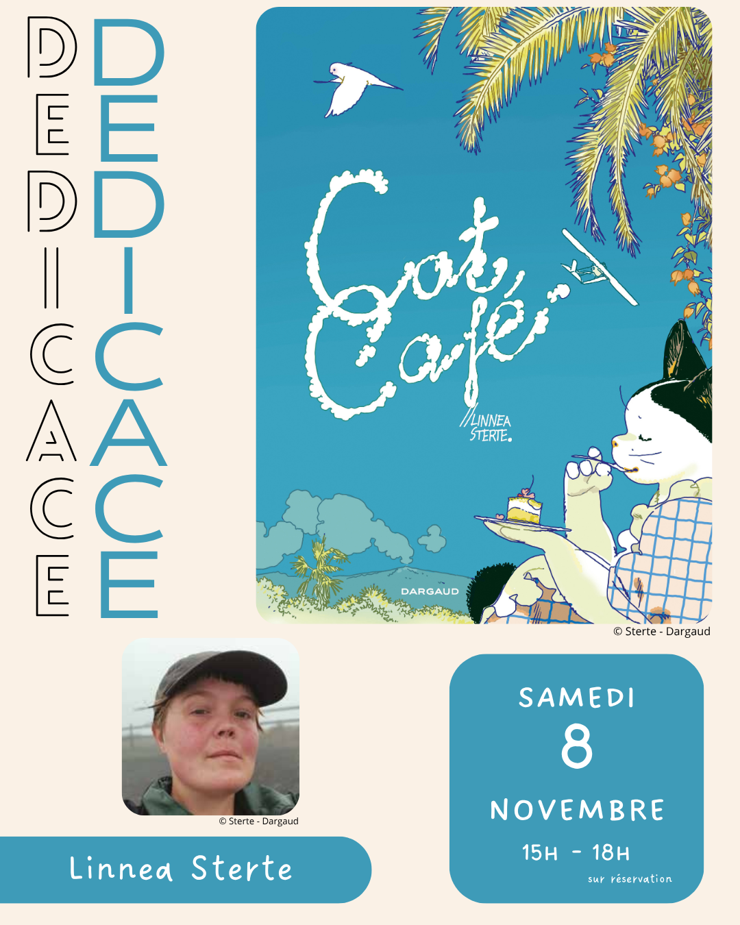 -Sur réservation par téléphone ou à la librairie- Linnea Sterte est une autrice et dessinatrice suédoise. Elle a grandi à Luleå et a commencé à dessiner dès qu'elle a pu tenir un stylo et depuis personne ne lui a dit d'arrêter. Aucun de ces livres ne passe inaperçu, "Stages of Rot" fut nominé aux Eisner Awards de 2018 et elle reçut le Fauve révélation en 2023 pour "Une rainette en automne" (Les Éditions de La Cerise). La finesse et la beauté de son dessin lui donne déjà une aura internationale et confirme l'avènement d'une grande autrice. L'histoire : Sur une île perdue du Pacifique, Ophélie, une jeune chatte reprend en main CAT CAFÉ, le salon de thé familial après que sa sœur aînée, Miranda, se soit cassée le bras. La tâche n'est pas aisée car le CAT CAFÉ a la réputation d'offrir les meilleurs gâteaux et les pâtisseries les plus fines. Ophélie saisit cette opportunité, certaine de pouvoir relever le défi. Mais on ne peut pas tout prévoir dans la vie et encore moins l'arrivée d'un séduisant et mystérieux chat joueur de guitare, d'un pilote et de son avion fait maison et d'une gigantesque fête d'anniversaire surprise ! Chamboulements, love story et délicieuses douceurs à peine sorties du four voilà le menu qui vous attend au CAT CAFÉ !