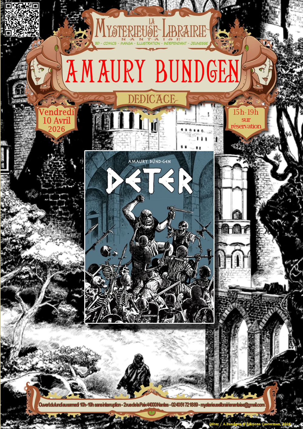 Amaury Bündgen nous avait transporté dans les tréfonds de Ion Mud puis dans les hauteurs de Vertigéo. lI nous avait initié à l'Héroïc Fantasy avec Le Rite. Il nous plonge cette fois-ci dans la Dark Fantasy avec Déter. Cette créature taciturne fera tout pour atteindre son but : le donjon de son ancien maître... Rendez-vous Vendredi 10 Avril pour la dédicace de Déter (éd.Casterman) de 15h à 19h